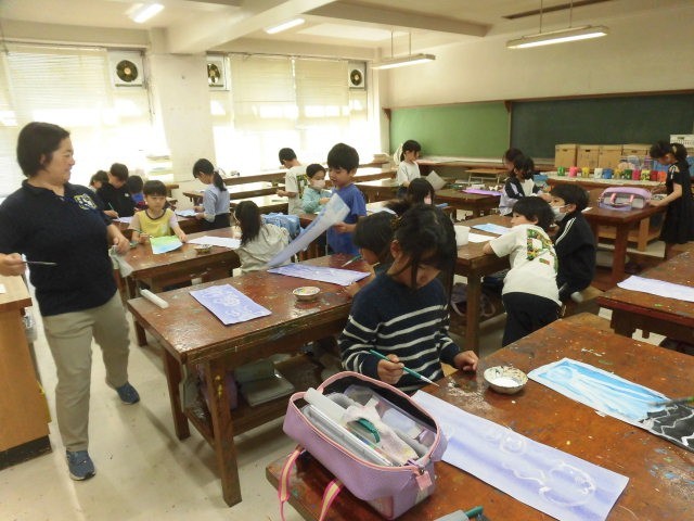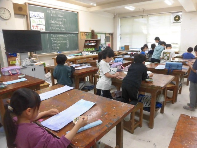 3年生の授業は図工です。「水が好きなくらげたち」と題して、水彩画を描いています。