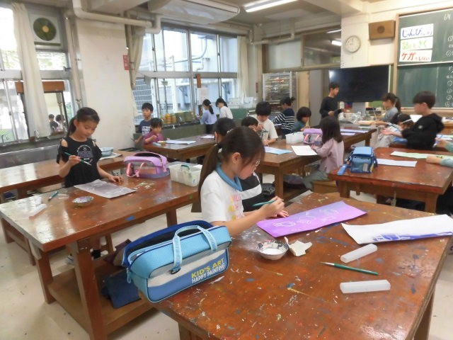 クレヨンで水をはじかせたり、絵の具をうすい色で塗った上に濃い色で塗ったりしています。子どもたちは思い思いのクラゲを描いていました。