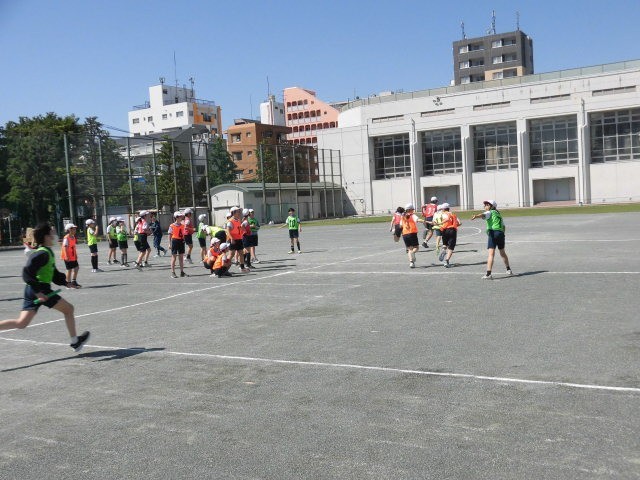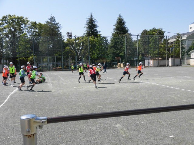 チームに分かれバトンパスの練習をした後、実際にトラックを使ってリレーを行いました。始まると、子どもたちは応援の声をあげています。友達を応援する声は、いつ聞いてもとてもすてきです。