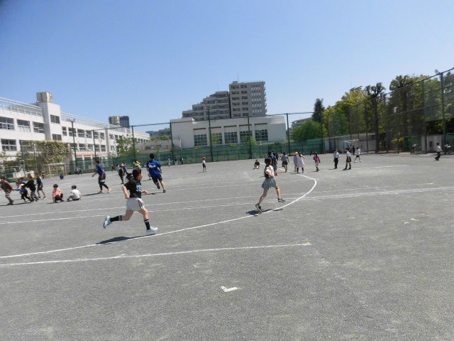 子どもたちはおにごっこやボール遊びで遊んでいます。トラックのラインを使って、リレーをしている人たちがいます。ラインを見つけると子どもたちは走り出します。