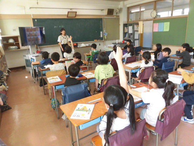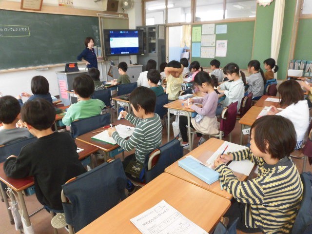 子どもたちは、先生の話をしっかりと聞いて授業に取り組んでいました。配られた紙をのりでノートにしっかりと貼っています。
