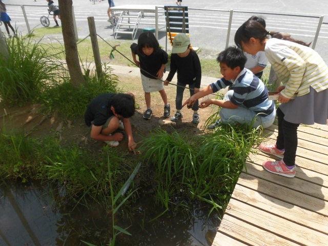 中休みになりました。子どもたちが校庭に出てきました。トラックを使ってリレーをして遊んでいる人がいます。ビオトープにいる生き物を観察している人もいます。途中、どこからかサナギを見つけたと言って、見せに来てくれた人がいました。大きなサナギでびっくりです。何のサナギでしょう。