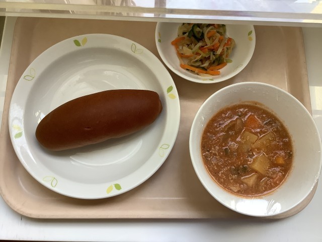 牛乳・ココアパン・ハンガリーシチュー・切干大根のサラダ