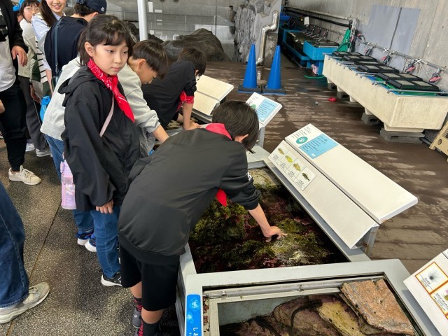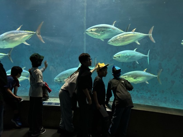子どもたちはマグロを見ています。マグロの大きさにびっくりしています。潮だまりにいる生物の触る体験をしている人がいます。恐る恐る触ろうとしています。赤ちゃんペンギンの可愛さに子どもたちみんな声をあげていました。