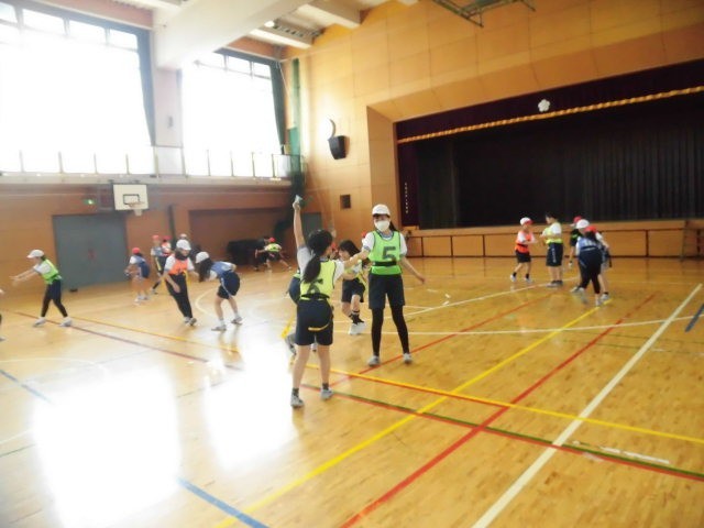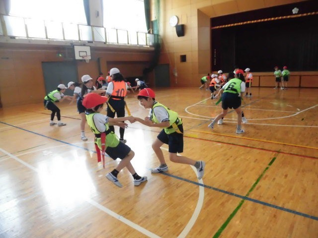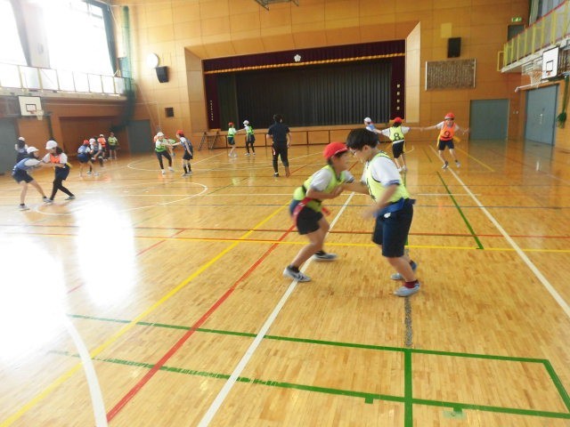 4年生の授業は体育です。タグを使っておにあそびをしていました。二人組で手をつないだまま、タグを取り合います。横に動いたり回ったり、ひねったりするなど不思議な動きをして、相手をかわそうとしています。相手のタグをとったときは、歓声をあげていました。
