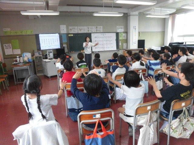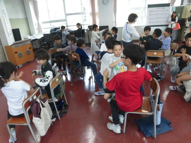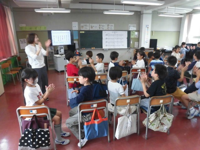 2年生の授業は音楽です。「茶摘み」のリズムに合わせて手遊びをしています。子どもたちはみんな楽しそうです。