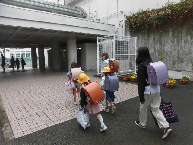 土曜日に引き取り訓練があったため、子どもたちは防災頭巾をもって登校しています。荷物が少し多めの朝です。
