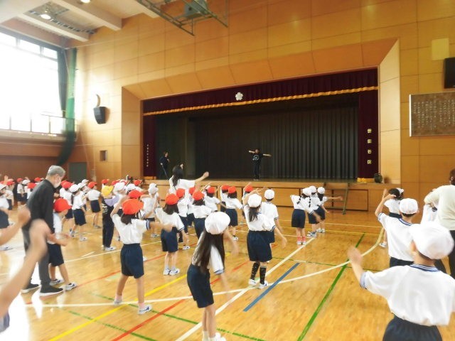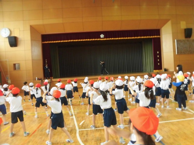 1年生2年生は体育館に集まり、運動会のリズムの練習をしていました。