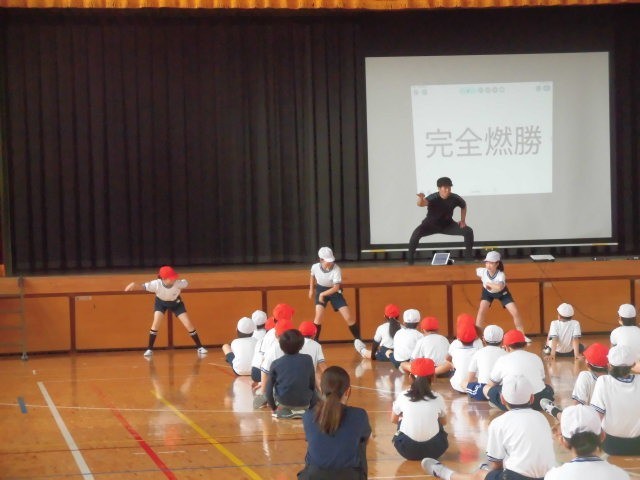 実行員の人が前に出てお手本の踊りを披露しています。第1回目の練習ですが、子どもたちは見よう見まねでコツを意識し踊っています。運動会まで3週間、子どもたちの演技期待しています。