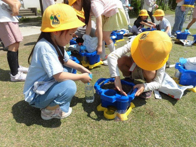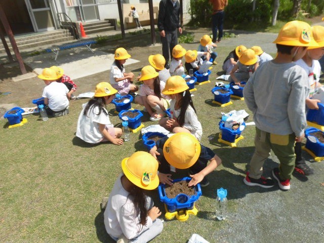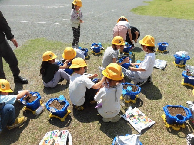 1年生は校庭に出てきて、アサガオの種を植えていました。鉢に土を入れて穴をあけ、種を入れています。最後に水をあげていました。