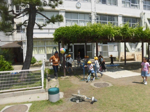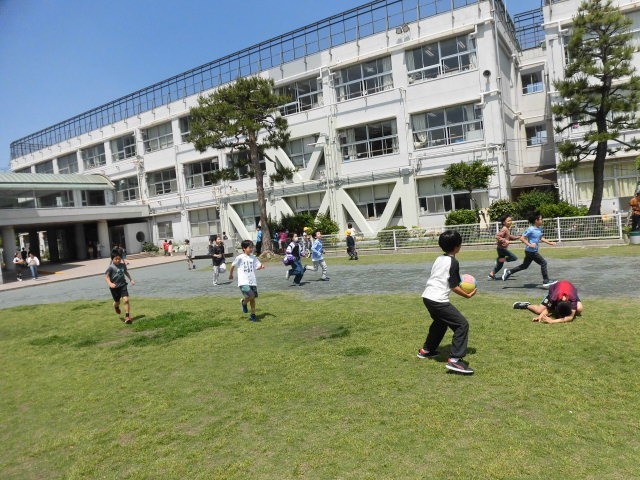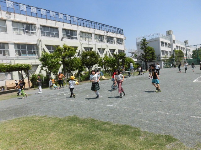 気持ちのよい青空の中子どもたちが遊んでいます。おにごっこで走り回っている人は、額に汗をかいています。低学年の人たちには、一輪車が大人気です。