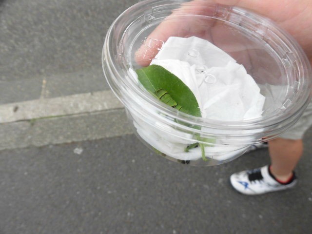 つかまえたアゲハチョウの幼虫を持ってきた人もいました。とても大きな幼虫です。