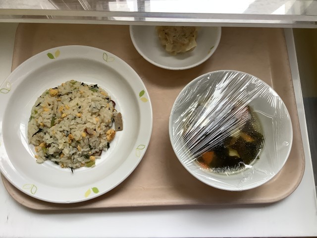 牛乳・青菜の炒飯・ジャンボしゅうまい・豆腐とわかめのスープ