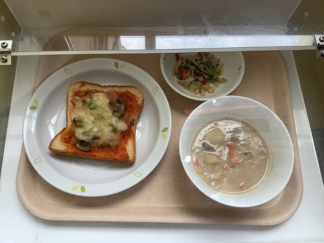 今日は、ピザトーストに春野菜たっぷりのシチューを提供しました。