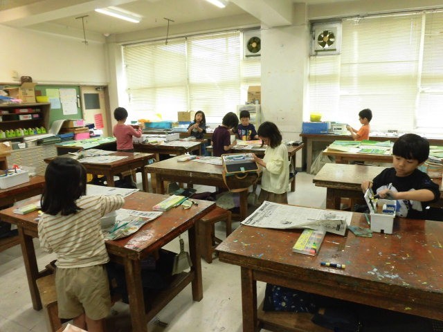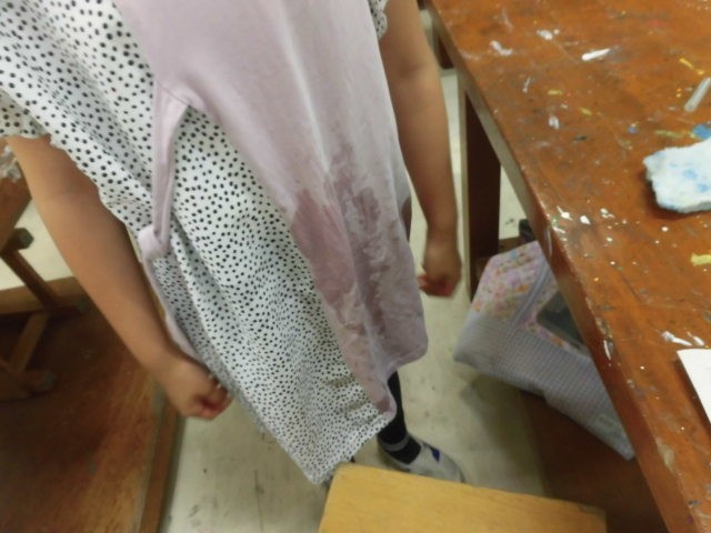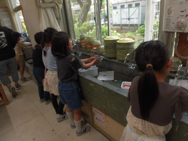 図工室をのぞいてみると、2年生が授業で使った絵の具の片づけをしていました。水道でパレットや筆を洗っています。洗い終わった人はタオルで拭いています。「洗っていたら服がぬれっちゃった。」と言って、見せてくれた人もいました。