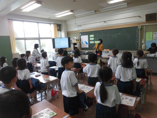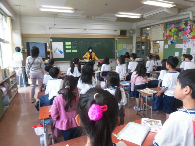 1年生の授業は音楽です。運動会で歌う校歌や運動会の歌の練習をしていました。