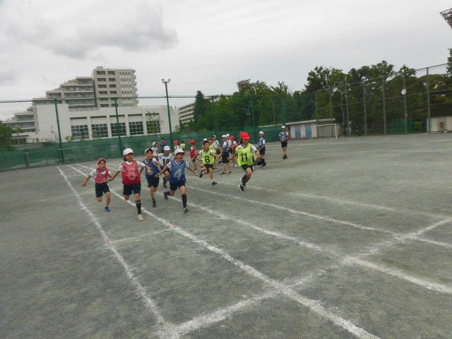 子どもたちは真剣な表情です。バトンを受け取る人は、後ろをほとんど振り返りません。ほぼ同じスピードで走っています。