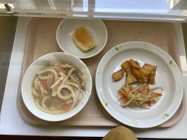 牛乳・鳥南蛮煮込みうどん・味噌ポテト・もやしときのこのサラダ・果物(河内晩柑)