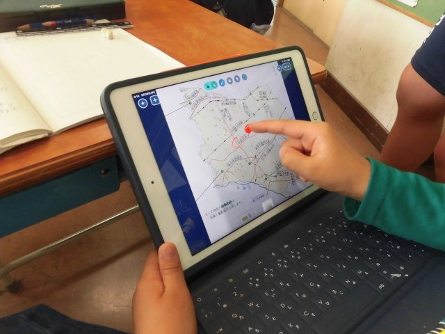 先生から区内にある畑の場所の地図をもらい、どこに多いかを考えています。しっかりと方位を意識しながら考えている人や、地図に線を引き、「〇〇側のかたまっている。」などと、分析している人がいました。