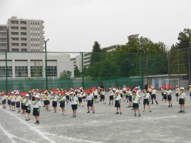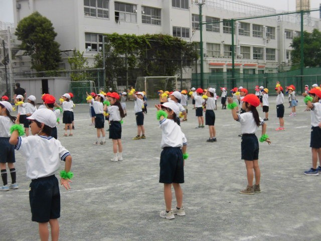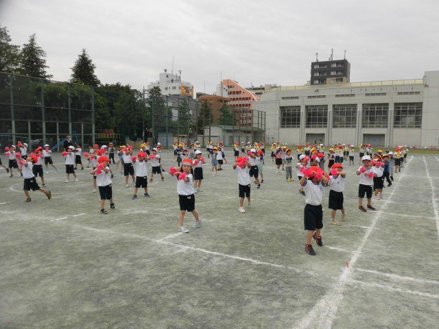 本番さながらに両手に飾りをつけて踊っています。子どもたちの動きに花を添えています。広い校庭で思い切り踊ることが嬉しくてたまらない様子の1年生と2年生です。