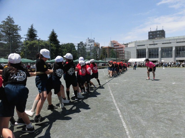 6年生5年生の追いかけ綱引きです。お助け隊が走ってやってきて綱引きに加わると、今までとは状況が変わります。お助け隊の力が重要です。