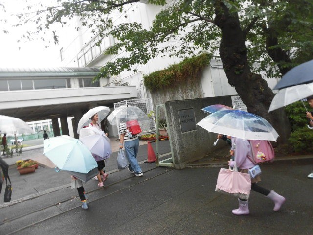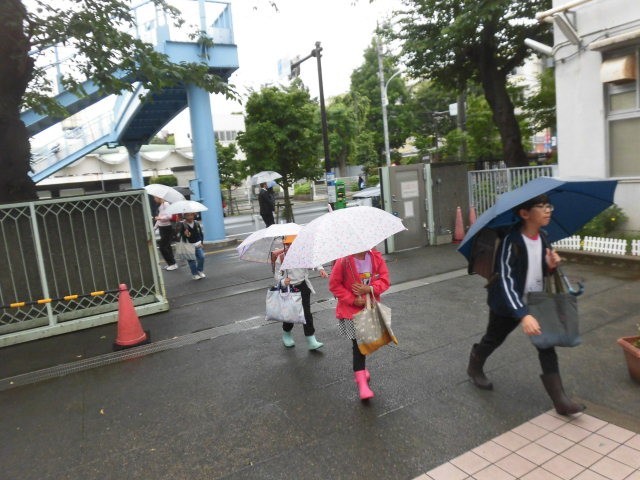 子どもたちが登校してきました。雨が降っています。運動会の日は、雨が降らなくてよかったです。