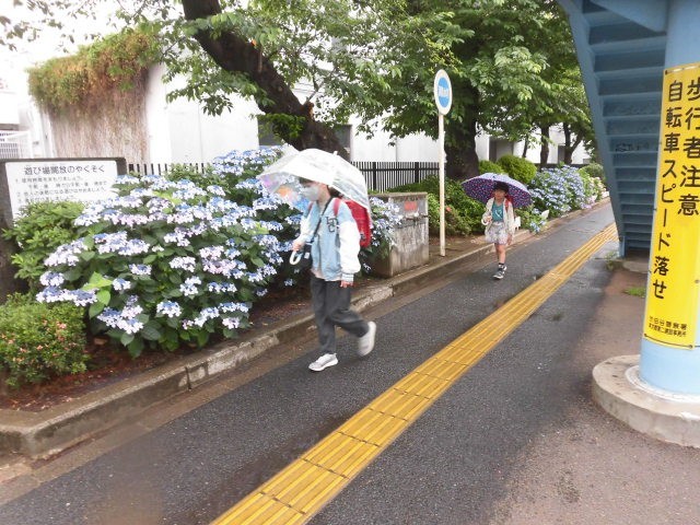 雨の日は、アジサイの花がより美しく見えます。アジサイの前を通って、子どもたちは正門をくぐります。