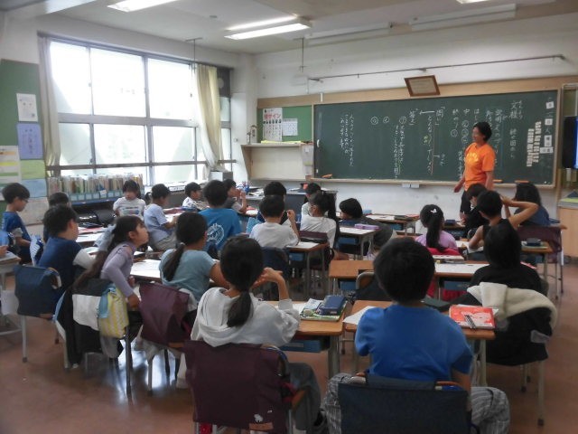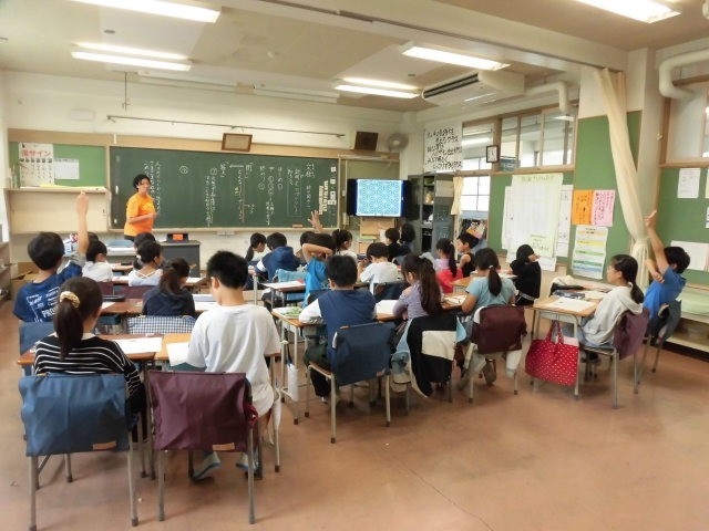 3年生の授業は国語です。説明文の組み立てや「問い」に対しての「答え」について、子どもたちが話をしています。担任の先生からの問いかけに、子どもたちは自分の考えを表現します。すると、それに対して、疑問に思ったことや付けたしなどの声があがります。子どもたちは自分の思いをハンドサインで伝えています。友達の発言をしっかりと聞いている子どもたちです。