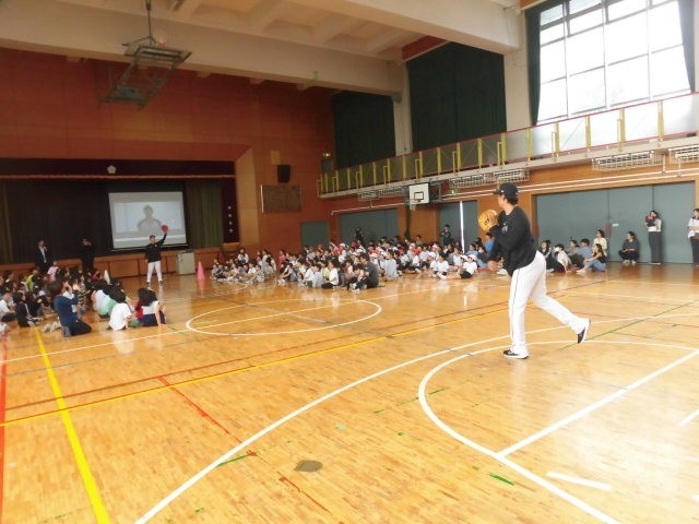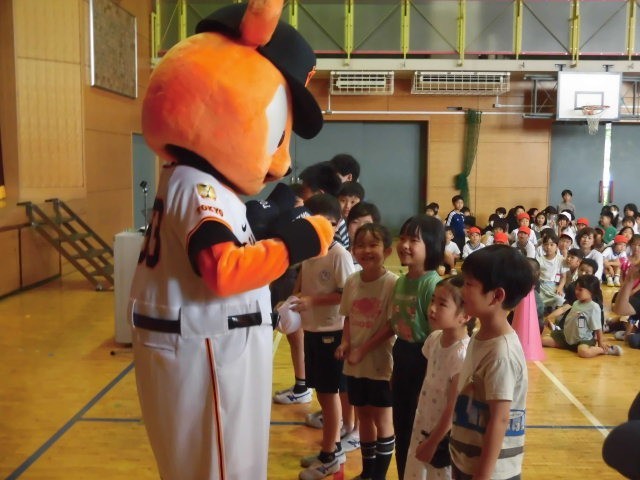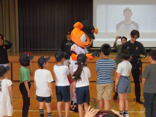 そして、赤星選手からのプレゼント、全校児童分のジャイアンツの帽子がクラス代表に渡されました。ジャビット君に帽子をかぶせてもらい、とてもうれしそうな子どもたちです。