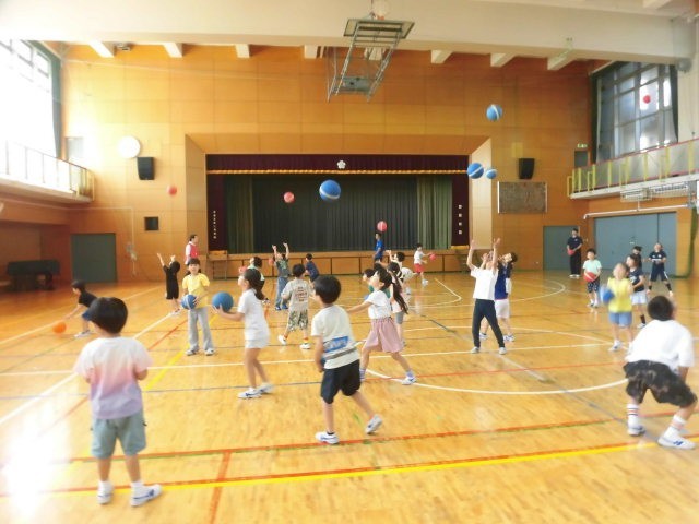 お父さんやお母さんと一緒に楽しく子どもたちはドッジボールをしています。楽しそうな表情がとてもかわいらしいです。