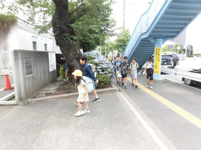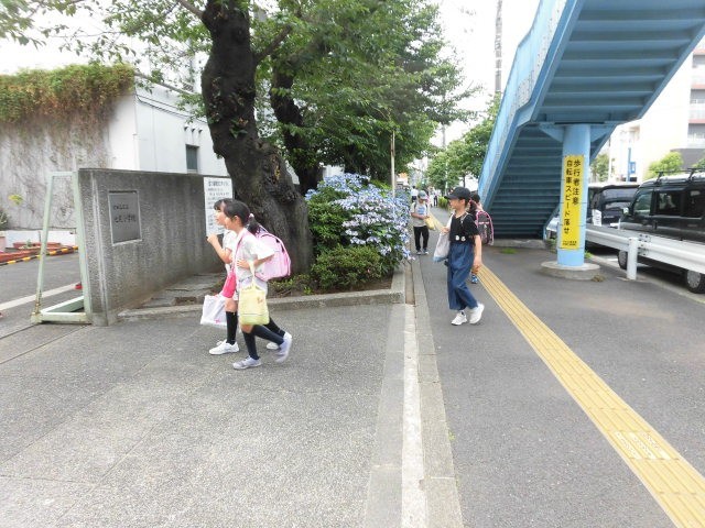 子どもたちはきれいな咲いているアジサイの横を通り、学校に入ります。