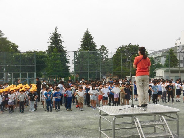 早くから校庭に集まった子どもたちは、みんなが揃うのを静かに待っています。あとから来る人たちも、その雰囲気を感じているようです。周りの状況を考えながら行動することができる池尻の子どもたちです。