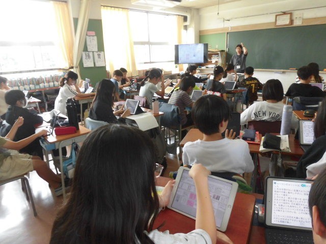 6年生の一つのクラスは国語の授業です。自分の考えを明らかにして、意見文を書いています。全員が同じテーマで書いた意見文をみんなで見合っています。友達の意見文を見ながら、自分の考えを深めています。