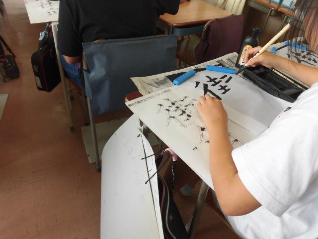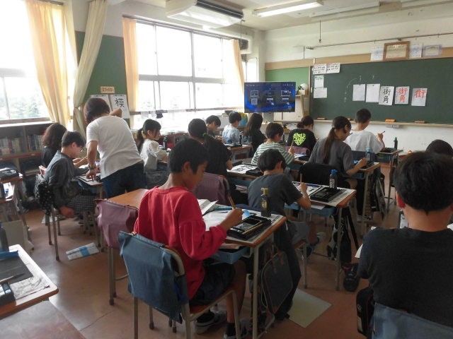 隣のクラスでは習字をしていました。「街角」という字を書いています。画数が多いので集中を切らさないようにするのが大変です。「角」の字に難しさを感じている人がたくさんいました。
