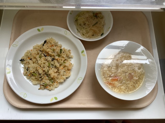 牛乳・青菜とじゃこの炒飯・卵入り中華スープ・春雨サラダ
