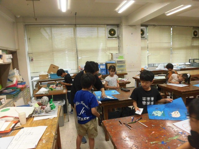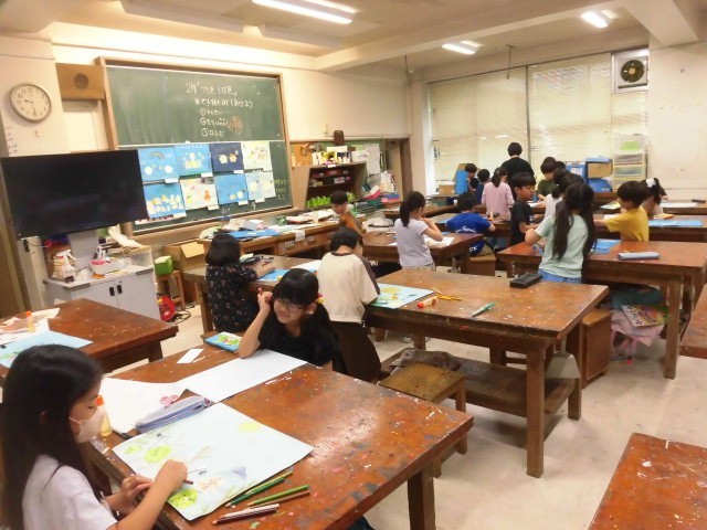 2年生の授業は図工です。「つち色 しば色」と題して、一人ひとりがいろいろな模様のつっちーとしばっちを描いています。