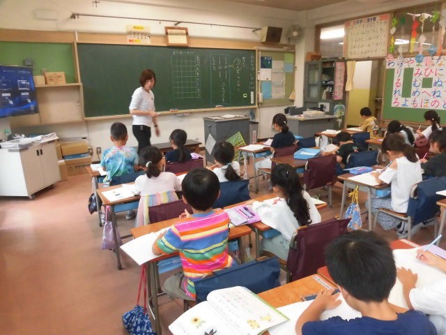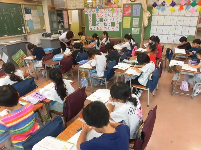 単語に助詞をつけて、短い文章を作ります。子どもたちは、ノートのマスを意識しながら文章作りをします。文章を書くことを楽しみにしている1年生です。
