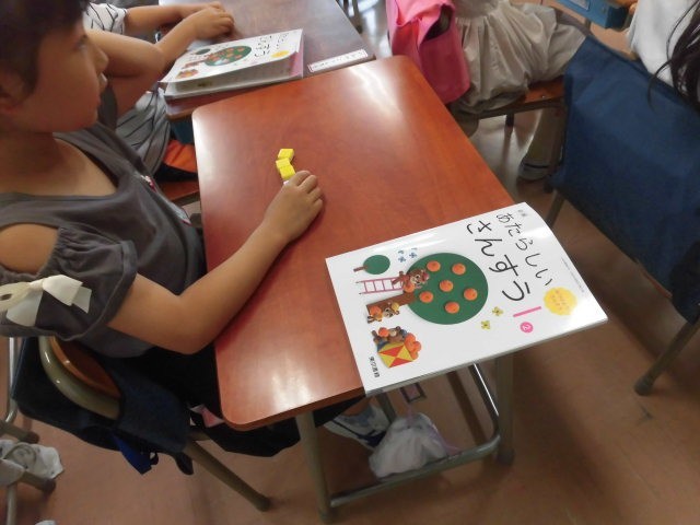 ブロックを使ってたしざんの学習をしています。この学習で初めて式が出てきたようです。