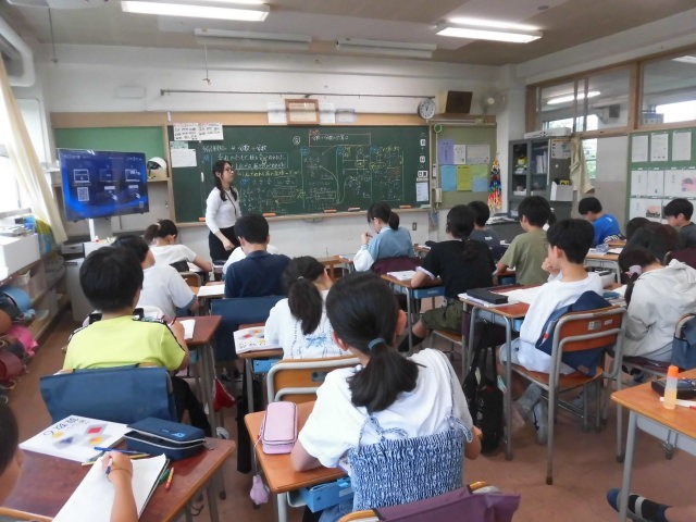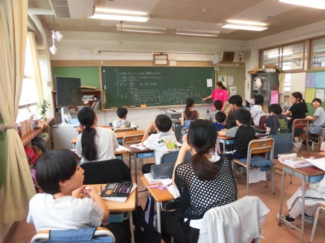 黒板には、いろいろな式が書かれています。子どもたちが黒板に書いた式もたくさんあります。低学年の教室から6年生の教室に移ると、黒板に書いている内容や字の大きさの違いにとまどってしまいます。難しそうな内容ですが、一生懸命に学習を進める6年生です。