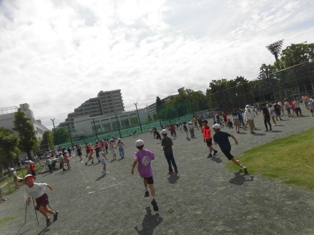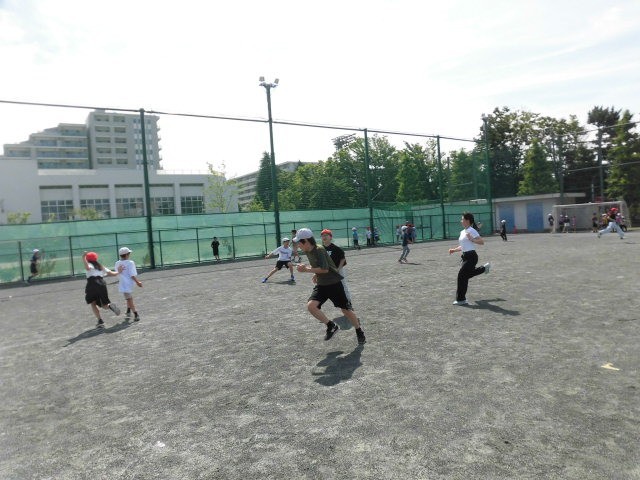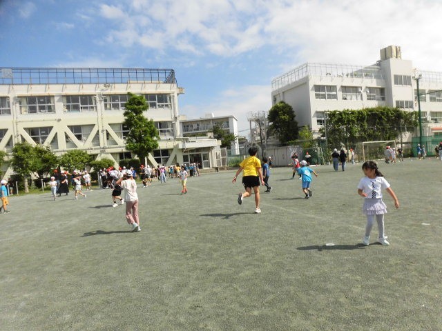 今日の朝の活動は朝遊びです。子どもたちが元気に校庭を走っています。