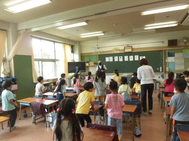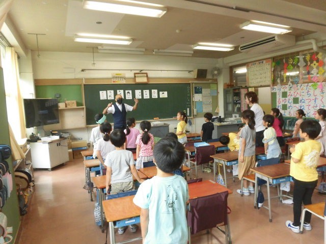 1年生の授業は外国語です。ALTの先生が来ています。
