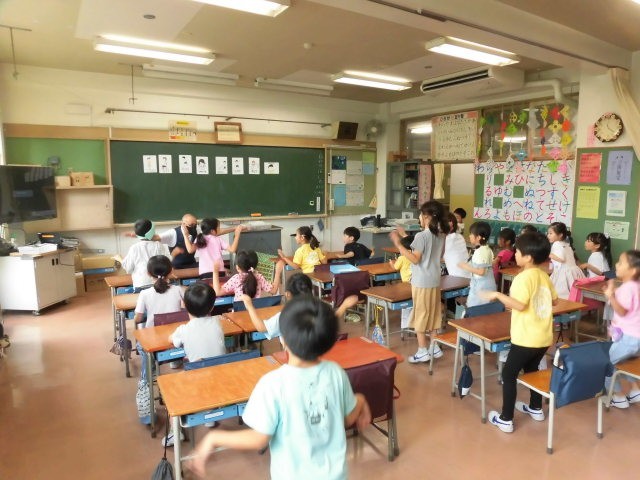 「立つ」「座る」「書く」「読む」「飛ぶ」などの動作に関する単語を口にしながら、動きで表します。子どもたちはとても楽しそうに英語を口にしながら体を動かしています。