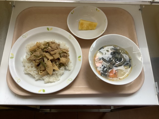 今日は、旬の生のパインアップルを提供しました。普段は、缶詰のパインアップルなので生のパインは甘くみずみずしいため子供達も大喜びでした。