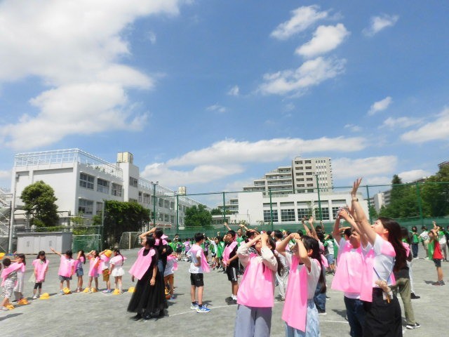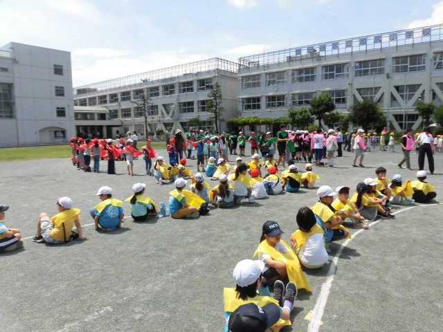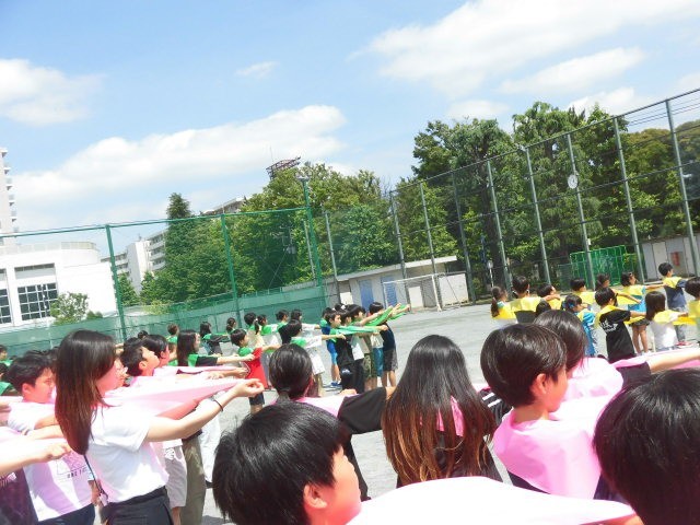 70周年記念の航空写真を撮りました。6年生の考えたデザインをカラーエプロンを付けた子どもたちで表します。セスナ機が飛んできました。学校の上を何度か旋回し写真を撮ってくれました。