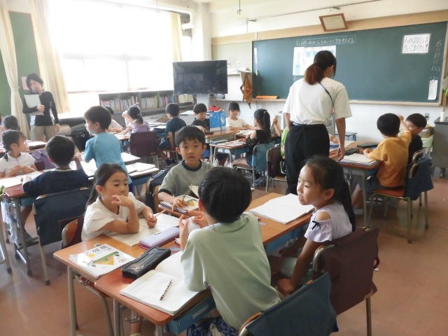 二種類の水筒を用意し、異なる大きさのコップで水の量を比べました。実際に操作があったので、子どもたちは興味津々です。授業の中で子どもたちは、いろいろなことに気付いています。それをグループでも意見交換などを行っていました。