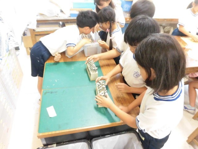 途中、粘土用スタンプを使う子もいました。それぞれが思い思いの作品作りに没頭していました。