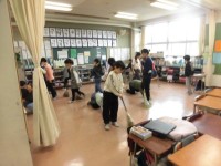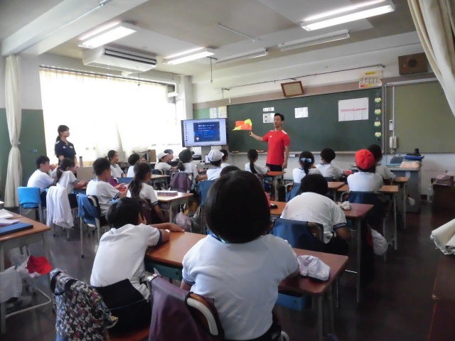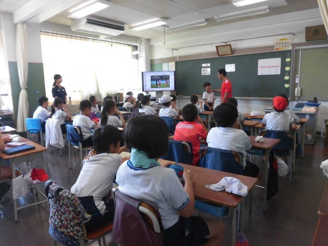 はじめは教室で、いろいろなサッカーの話をうかがいました。講師は、ロービジョンフットサルの日本代表チームのキャプテンの方です。今まで知らなかったいろいろなサッカーについて、子どもたちは興味深く話を聞いていました。