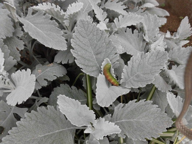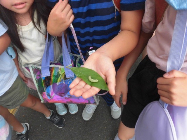 今朝、2匹の幼虫を見ることができました。1匹目は子どもたちが正門近くの歩道で見つけてきた幼虫です。葉の上にのせ見せてくれました。2匹目は主事室前のコンクリートの上にいる幼虫です。たくさんの子どもたちが集まっていたので行ってみるととても大きな幼虫でした。踏まれたら大変なので、花壇に逃がしてあげました。