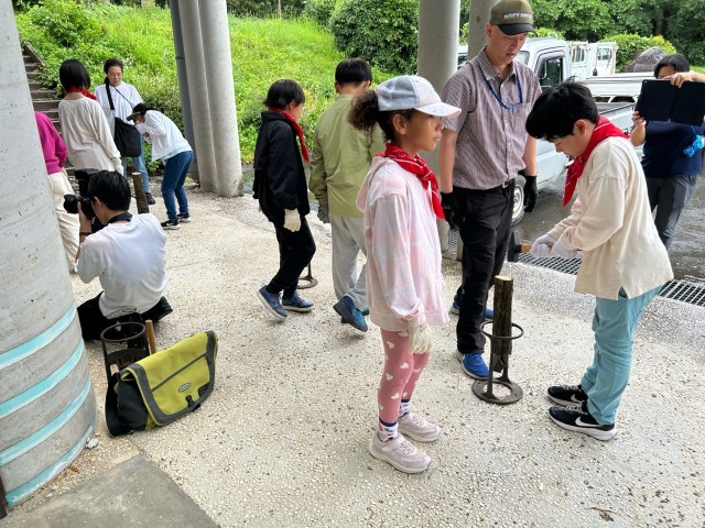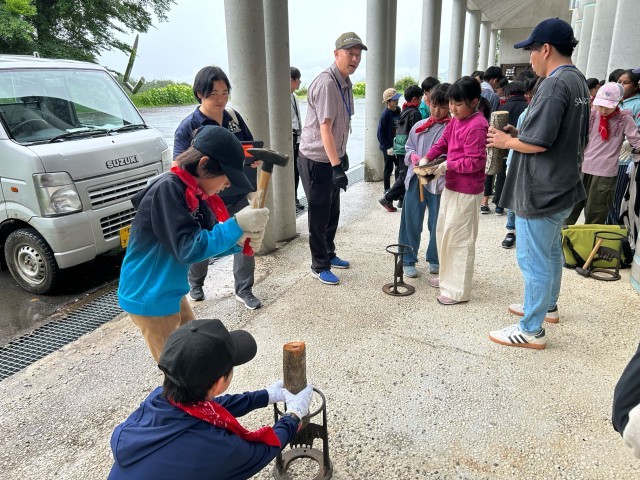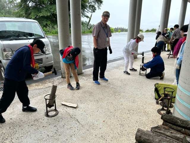 一つ目の活動は、まき割りです。まきを刃のついた土台に取り付けて、上からハンマーで叩きます。2つに割れたときは、気持ちがよいようでとても嬉しそうです。節があるの場合はなかなか割れないようで、何度も叩いている人がいました。