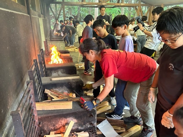 かまどに火がつきました。燃え上がる火を見て、子どもたちはとても嬉しそうです。